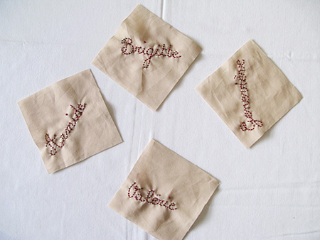 4) Je décide de broder, en souvenir, le prénom de chacune dans les carrés centraux.