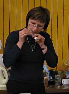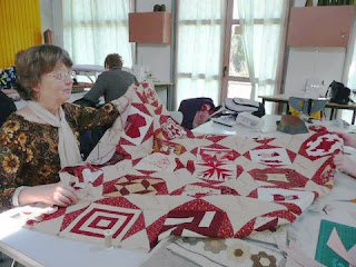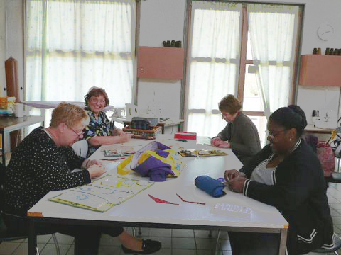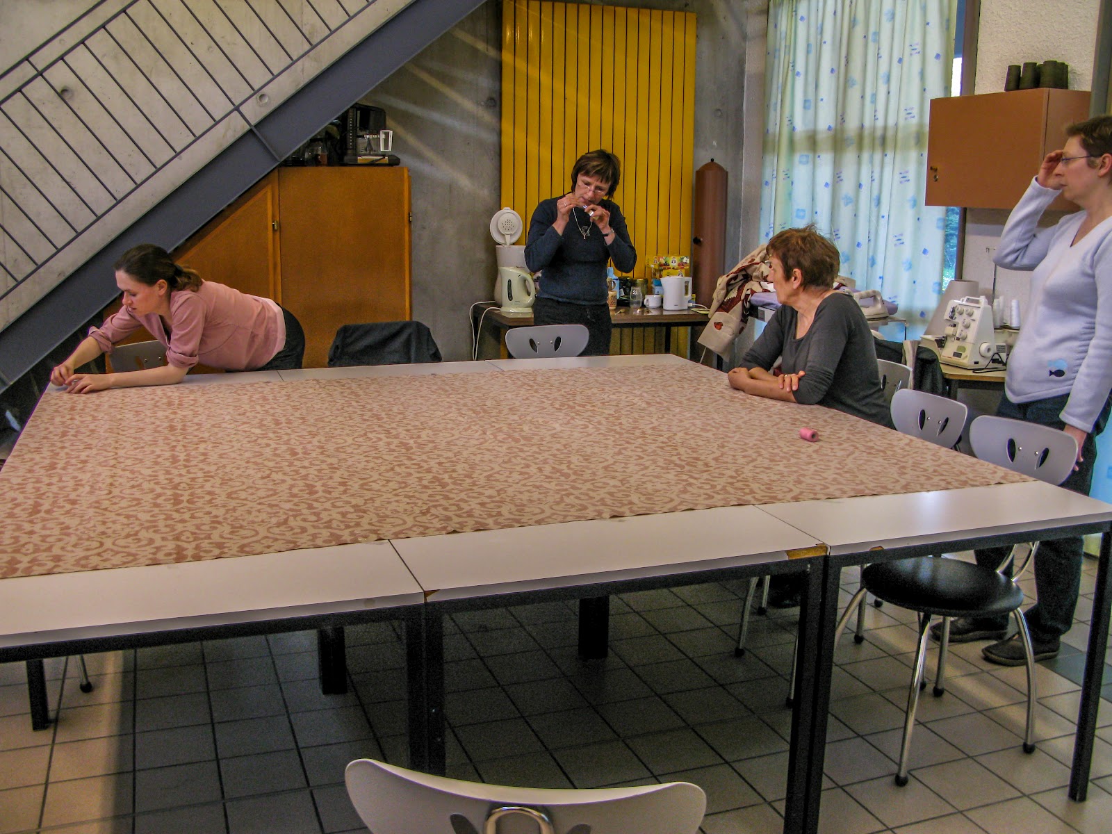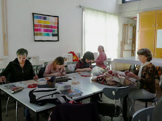 6) Dernière séance commune de travail. Une vrai ruche. Chacune à sa tâche.: On assemble les dernières bandes, on coud à la machine mais aussi à la main. On parle, on ri... nous sommes nombreuses... nous sommes bien.