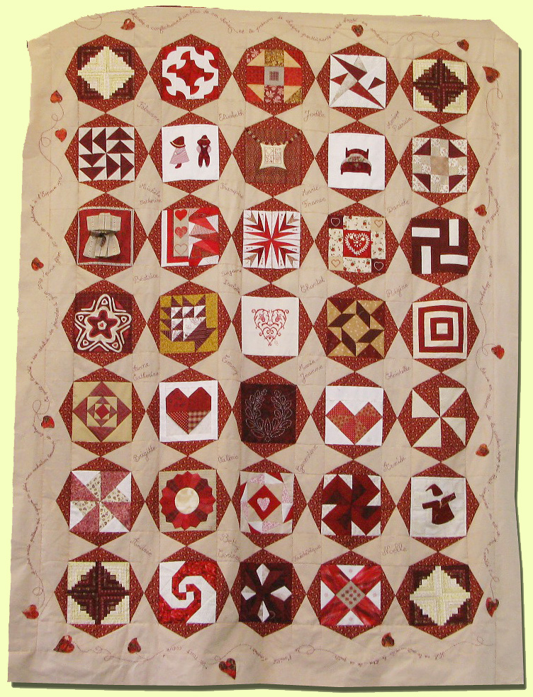 8) La petite idée fut de déposer de ci de là sur cette bordure finale des cœurs mais surtout de broder le texte suivant: « à notre amie quilteuse qui a gagné ce plaid, nous souhaitons beaucoup de bonheur. Ce quilt de l'amitié a été confectionné de janvier à juin 2008 pour fêter les 10 ans de Patchwork à l'Espace 110. Chacune a confectionné un bloc de son choix et le prénom de chaque participante à été brodé en souvenir. Au fur et à mesure que les blocs arrivaient, le thème du cœur se dégageait...Est ce en raison de la couleur rouge imposée ou est ce pour l'amitié ? Nul ne le sait mais le titre de ce quilt de l'amitié s'imposait : « DE TOUT CŒUR. »