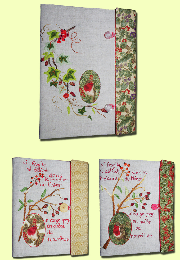 Cette année vous ne trouverez que des créations personnelles ( y compris les dessins de broderie, les formes d’oiseaux, la conception des objets). Cependant, il faut « rendre à César ce qui est à César » les grilles de points de croix qui ont servies de modèle pour les petits carnets proviennent d’un livre de Marie-thérèse Saint-Aubin. Cette artiste réalise des points de croix « très épurés » à partir d’aquarelles. Son travail est de toute beauté et j’ai eu la joie qu’elle me dédicace son livre. Par contre la conception du carnet est de mon cru.