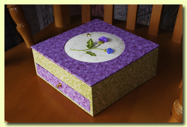 Et les choses se compliquent encore : Une boite à tiroir s.v.p. J'avais cette petite broderie en « strumpwork » qui attendait depuis longtemps. J'ai choisi de beaux tissus « à la Fée pirouette » et voilà la résultat.