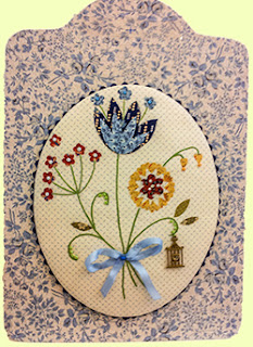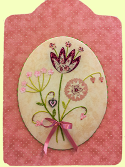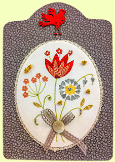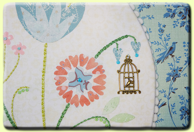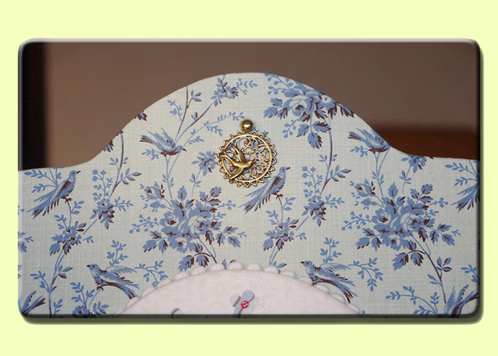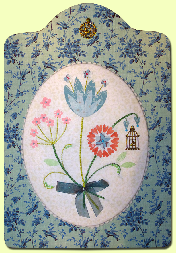 Voici la composition que j'ai imaginée : un tableau printanier mis en valeur sous forme de médaillon. C'est l'occasion d'aborder un peu de cartonnage, d'utiliser la technique de l'appliqué avec du Vliesofix et de mettre en valeur les quelques rubans et charms oubliés au fond de nos armoires.