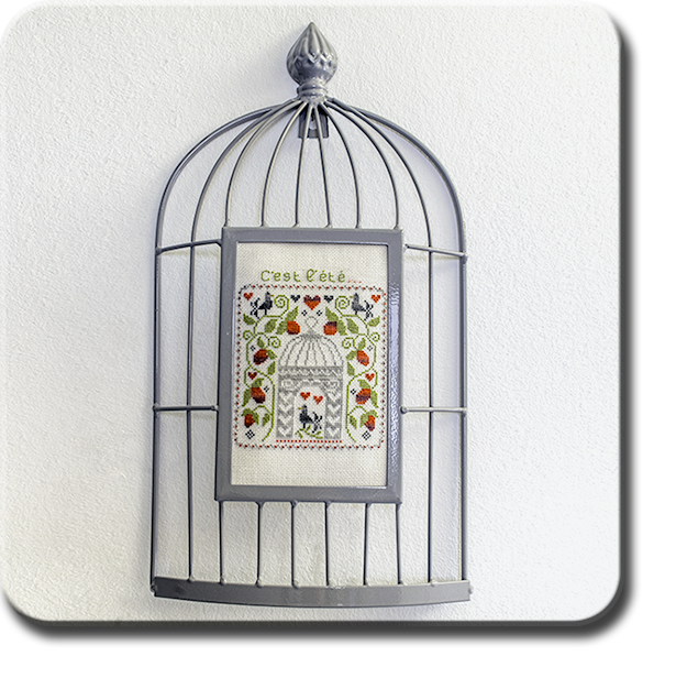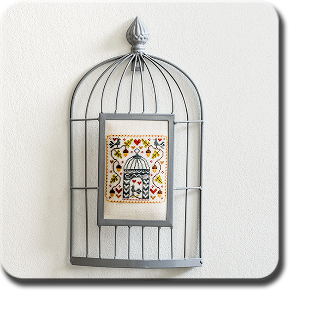 J'ai également eu la chance de dénicher dans un magasin de mobilier des cadres en forme de cage à oiseaux. En acheter 4 allait de soit pour y glisser dans chacun une broderie au point compté pour chaque saison.