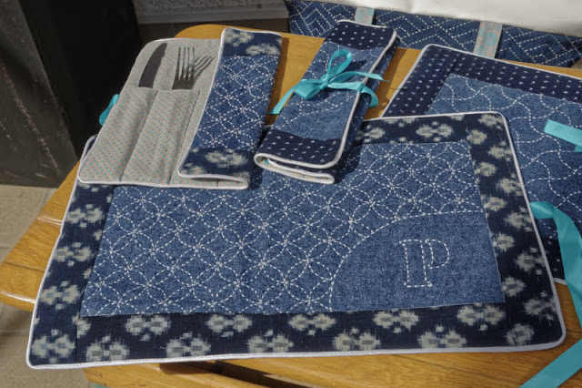 Pour composer un bel ensemble, deux petits paniers réalisés avec les mêmes tissus que les sets de table.