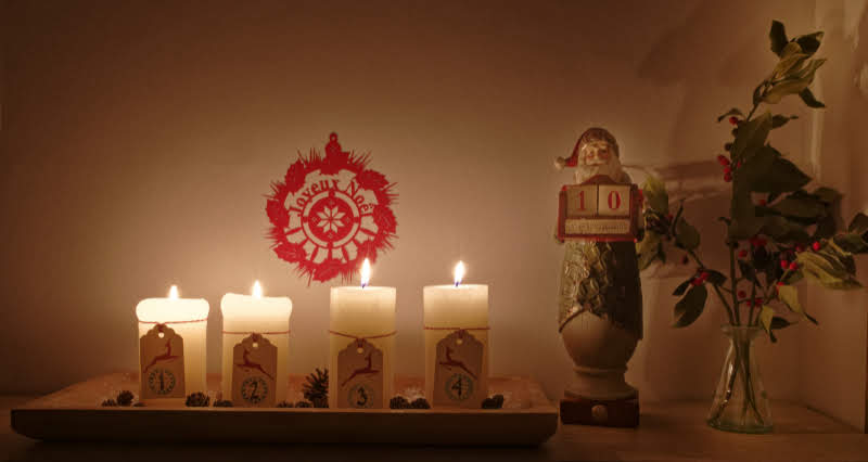 Et voilà la maison parée pour Noël. 4 bougies pour l'avent avec des étiquettes faites maison. En arrière plan un découpage de Noël.